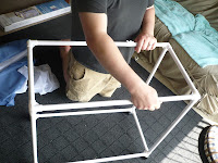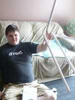 I have been "Spring Cleaning" lately, but just a little at a time. If I try to do too much at one time then I end up with a bigger mess than I started with. Last week, I wanted to do something with our laundry situation. We would just throw our dirty clothes on the floor and pick them up when we wanted to clean them. Yeah, that's not good! We went to get a hamper and we got a really cool one with three different bags for lights, whites and dark colors. Organization is awesome! I no longer have to dig through a mound of clothes. Yes! Here are some pictures of Craig putting the laundry hamper together.